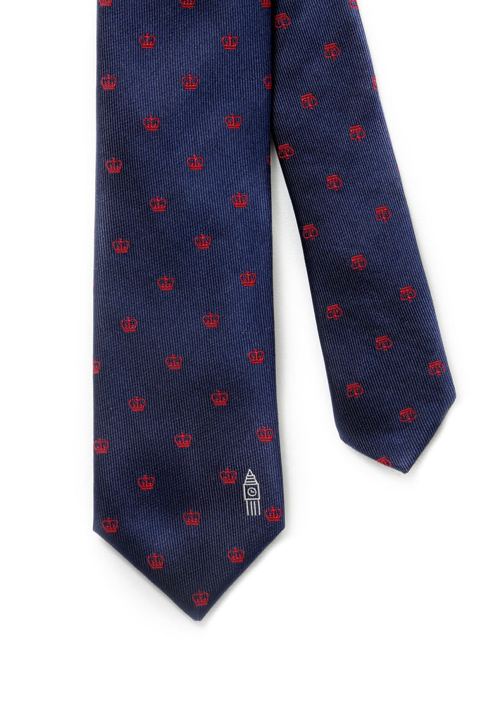 The Great Bell, more commonly known as Big Ben is displayed in the bottom corner of the tie. This iconic landmark sits more than 300 feet above London inside the Elizabeth Tower. This regal and royal Great Britain necktie is made with the traditional British colors of red, white, and blue. This is one of three styles offered representing this amazing part of the world.
